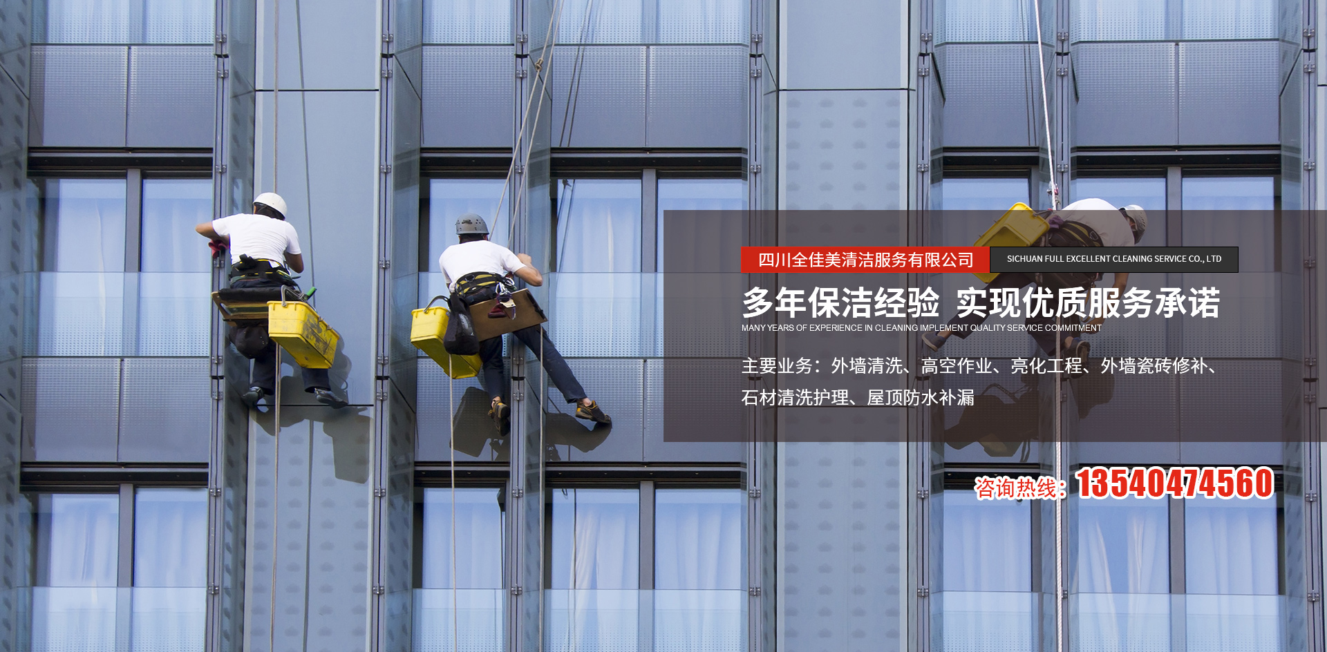 四川全佳美清潔服務有限公司成立于2017年11月20日,注冊資本200萬元人民幣,是一家專業從事高空外墻清洗,外墻維修,開荒保潔,石材養護,外墻防水等一體化的工程服務公司。公司先后服務于成都鐵路培訓學校,雙流空港酒店,省體育館等寫字樓及工業園區的外墻清洗保潔及維修服務。經過多年的發展與努力,公司已具備一定的規模及實力?,F擁有一支技術精湛的服務團隊,以高標準的服務品質,專業的安全技術實力,為全川不同群體的客戶提供更安全,更周到的清洗服務解決方案,期待與你的合作。